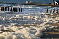 Wind en zon zorgen voor een prachtige dag. Grote golven en veel schuim. Dagje aan zee. Westkapelle, Provincie Zeeland, Walcheren.