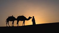 Hier zie je Omar met twee kamelen in de Sahara woestijn. Tijdens zonsondergang met hem op pad geweest met deze twee kamelen en foto's gemaakt.