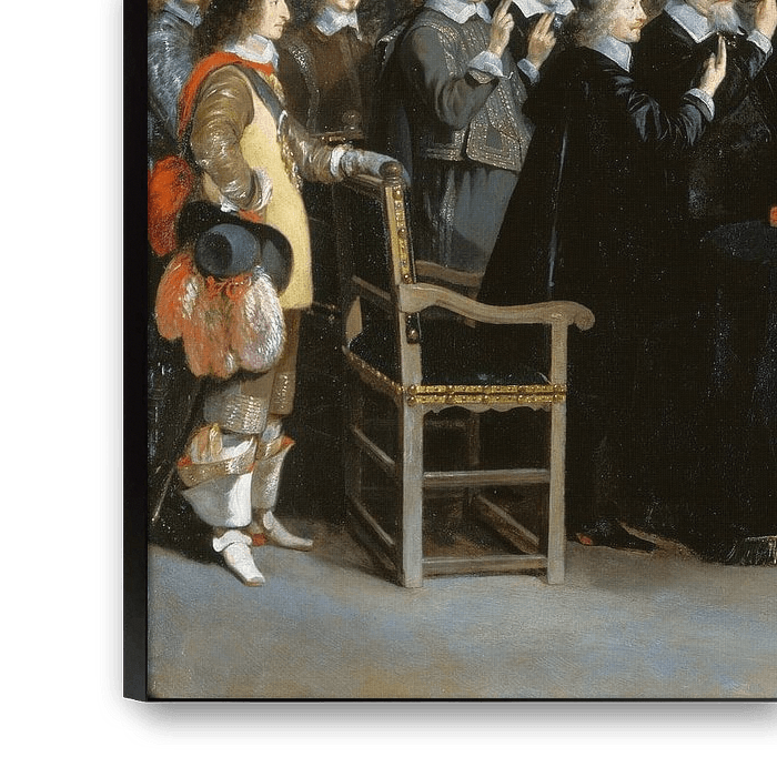 Dit is een uiterst belangrijk moment: Nederlanders en Spanjaarden sluiten na een oorlog van tachtig jaar eindelijk vrede. Dit gebeurde op 15 mei 1648 in het stadhuis van de Duitse stad Munster. Links staan de Nederlandse onderhandelaars, rechts de Spaanse. Op de tafel voor hen liggen de twee exemplaren van het vredesverdrag, die in de kistjes ernaast naar Madrid en Den Haag gestuurd zouden worden.