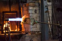 Deze foto vangt het intense moment van het glasblaasproces in Harrachov, waarbij een glas wordt verhit door een vlam, terwijl de gloed van de glasoven op de achtergrond het atelier zacht verlicht. Het beeld legt het samenspel van hitte, materiaal en ambacht vast, waarbij de kleuren van vuur en gesmolten glas een bijna hypnotiserende energie uitstralen. Het contrast tussen het gloeiende glas en de donkere omgeving accentueert de dramatiek van het creatieve proces.