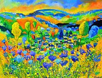 Dit fascinerende kunstwerk toont een levendig en kleurrijk landschap, waar een pittoresk dorpje floreert te midden van de weelderige natuur. De kunstenaar gebruikt krachtige en contrasterende kleuren. De velden met paarse bloemen op de voorgrond creëren een zee van kleuren die meteen in het oog springen. De glooiende heuvels op de achtergrond zijn geschilderd in warme oranje en groene tinten, die een flamboyante herfstperiode oproepen. De gestileerde bomen voegen een bijna droomachtige dimensie toe aan het tafereel, met slanke silhouetten die lijken te dansen in de wind. De vleugjes blauw en geel in de lucht versterken de vrolijke en dromerige sfeer. Dit schilderij onderscheidt zich door de harmonieuze balans tussen realisme en abstractie en biedt een idyllisch en levendig beeld van een wereld waarin natuur en mensheid in perfecte harmonie samenleven.