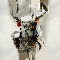 Sterk expressief, abstract werk met grijsgroene en bruine tinten, grafische elementen en een sterke textuur.