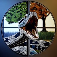 Een slang rijst op in het midden van een perfecte cirkel, zijn bek open in een bevroren moment van waarschuwing en ontwaken. Verdeeld door een verticale as verandert de wereld erachter van vernieuwing in verval - groen leven aan de ene kant, herfstige overgave aan de andere. De slang wordt een levende drempel die evenwicht, gevaar en…