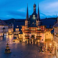 Een vierkante 1:1 foto van het beroemde stadhuis in Wernigerode in de avond tijdens het blauwe uur.