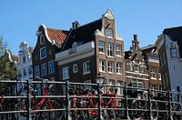 Fietsen, een grachtenbrug en typisch Nederlandse huizen in Amsterdam
