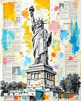De combinatie van de klassieke afbeelding van het Vrijheidsbeeld en de hedendaagse grafische accenten geeft een gevoel van tijdloze relevantie en culturele diversiteit. Het standbeeld, een symbool van hoop en vrijheid, wordt ondersteund door het levendige kunstwerk erachter, dat de dromen en aspiraties weergeeft van de mensen die in deze bruisende metropool wonen. Dit beeld vangt niet alleen de fysieke aanwezigheid van het Vrijheidsbeeld, maar ook de essentie van de Amerikaanse droom in een dynamische, moderne context.