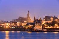 Prachtige skyline stadsgezicht avond/nacht opname tijdens het blauwe uur van het Steen en de Sint-Pauluskerk gezien vanaf de linkeroever van de Schelde in Antwerpen, Belgie
