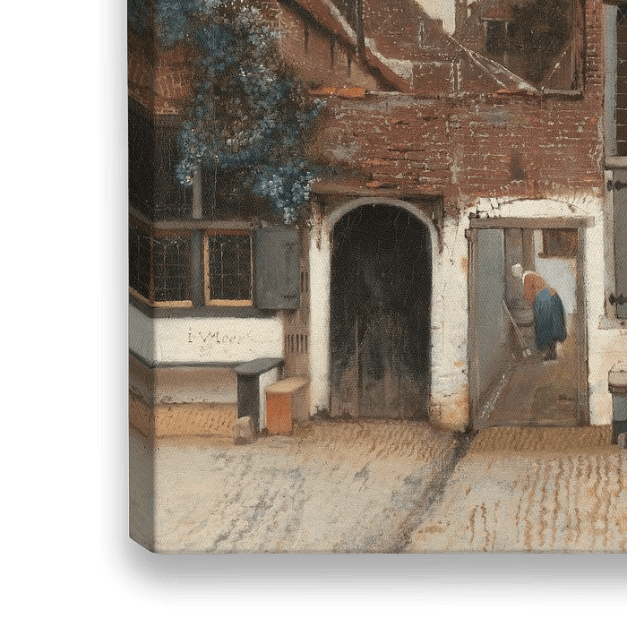 Gezicht op huizen in Delft, bekend als 'Het straatje'. De gevels van enkele huizen aan een straat in Delft. Tussen de huizen een steegje waar een vrouw over een wastobbe gebogen staat. In de openstaande deur van het huis rechts zit een vrouw te handwerken, links voor het huis op de stoep twee spelende kinderen.