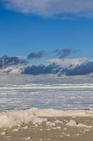 Het strand van Terschelling, wat een mooi gezicht zo met die wolken, de zee en het schuim. Een prachtige plaat met de zon erbij!