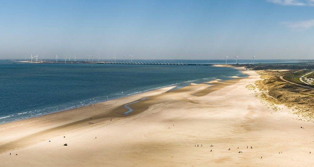 Een dronebeeld van het prachtige strand van Vrouwenpolder in de lente. Op de achtergrond is de Oosterscheldekering zichtbaar