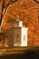 Het theehuisje staat te schitteren in de mooie herfstzon met de mooie beukenbomen op de achtergrond.