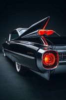 De foto toont de indrukwekkende achterkant van een Cadillac Series 62 coupé - onmiskenbaar met grote, futuristisch ogende staartvinnen en dubbele raketvormige achterlichten. Het glanzende zwart van de lak, het royale chroom en de elegante lijnen creëren een iconisch silhouet van het autotijdperk van eind jaren 1950 tot begin jaren 1960.…