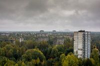 Deze foto is gemaakt vanaf de 16e verdieping van de hoogste flatgebouwen van Pripyat, de verlaten spookstad bij Chernobyl. Het geeft een mooi beeld van hoe groot de stad is, met de kerncentrale op de achtergrond.