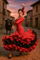 Midden op het plaveisel van een oud Andalusisch dorp rijst de danseres op als een natuurkracht. Haar houding is niet alleen een uitdrukking, maar ook een beschuldiging, een uitdaging en een bron van trots. De ondergaande zon baadt het tafereel in een dramatisch licht van goud en paars, alsof de hemel zelf zijn adem inhoudt.