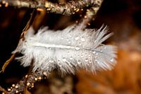 Op het veertje druppeltjes. Zou het van de dauw zijn? Of van de regen van gisteren?