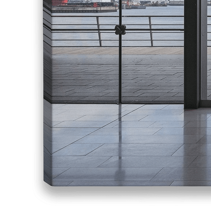 Ontdek de fascinerende schoonheid van moderne architectuur met deze creatieve muurschildering. De afbeelding toont een perfect symmetrisch uitzicht door een moderne glazen gevel. Deze heldere en minimalistische glazen gevel, verdeeld in kleine vierkanten, trekt de aandacht naar de imposante havenkranen op de tegenoverliggende oever van…