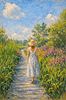 Een smalle plankier slingert zich door een zee van groen, alsof hij zich aarzelend een weg baant door een landschap dat ooit bos was en het nog altijd in zijn adem draagt. Riet en gras fluisteren langs de randen, hun stemmen zacht als herinneringen aan getijden die hier verdwenen zijn, maar nooit geheel vergeten. Paarse bloemen branden…