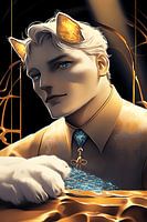 Een betoverende figuur die baadt in een gouden gloed en een aura van macht, mysterie en luxe uitstraalt. Met zijn kattenoren die knetteren van energie en zijn doordringende azuurblauwe ogen die onnoemelijke geheimen herbergen, is hij de belichaming van elegantie en controle. Zijn poot raakt een glinsterende poel van vloeibaar goud aan,…