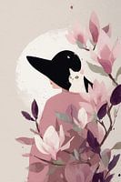 Een illustratie in zachte tinten roze en paars, waarin een silhouet met elegante hoed en een witte kat zich aftekent tegen een volle maan. De compositie wordt omlijst door bloeiende magnoliatakken die een romantische, dromerige sfeer creëren. De minimalistische stijl en het beperkte kleurenpalet geven het werk een moderne, sophisticated uitstraling.
