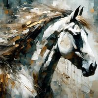 Een digitale weergave van een paardenhoofd mengt abstracte geometrische vormen met meer realistische details. Bruin- en goudtinten worden gebruikt om een dynamisch en gefragmenteerd effect te creëren, wat een gevoel van beweging toevoegt aan het werk.