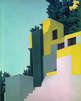 Het geel groene huis had een aparte sfeer. De witte trappen leidden naar de voordeur, maar het leek alsof niemand het huis ooit gebruikte. Achter het huis stond een grote plant met gele tropische bloemen, die nog mysterieuzer aanvoelde.
