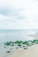 Een beeld van het strand in Cadzand. De mist zorgt voor zachte tinten van blauw en bruin. Het wier op de rotsblokken zorgt heldere groene tinten. Het is een uitnodiging om rustig weg te dromen.