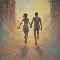 Ontdek "The Departure" van Andreas Manfred Gebhard, een opmerkelijk schilderij dat moderne techniek combineert met traditionele esthetiek. Dit kunstwerk toont een jong stel dat door een straat loopt, omringd door gebouwen met een levendig samenspel van gele, rode en blauwe kleuren.