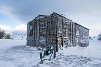 Een vervallen huis in de winter op Lofoten