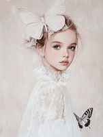 Dit kunstwerk straalt een zachte, poëtische sfeer uit waarin een portret van een meisje verweven is met een vlinders. De delicate kleuren en subtiele texturen creëren een gevoel van vergankelijkheid en mysterie. De vlinder symboliseert transformatie en vergankelijkheid. De expressie van het meisje is sereen, bijna dromerig, wat het geheel een meditatieve en introspectieve dimensie geeft. Het werk nodigt de kijker uit om stil te staan bij de schoonheid van het moment en de vluchtigheid van het leven.