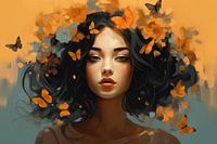 Het vlindermeisje in oranje. Illustratie van een jonge meisje omringd door vlinders en bloemen. Kies zelf het formaat en materiaal voor deze blikvanger.
