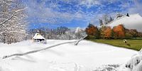 wanneer de winter jas sluit, of de winter komt over het land. Tussen de seizoenen. Een nieuwsgierige werk van een landschap in de winter met sneeuw