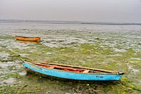 Aan de vredige kusten van Diu, India, wachten vissersboten bij eb op een tapijt van felgroen zeewier. Ontdaan van het water dat ze normaal gesproken dragen, lijken ze bevroren in een moment van rust. Het contrast tussen hun kleurrijke rompen en de groene tint van de blootgelegde zeebodem zorgt voor een schilderachtig en uniek…