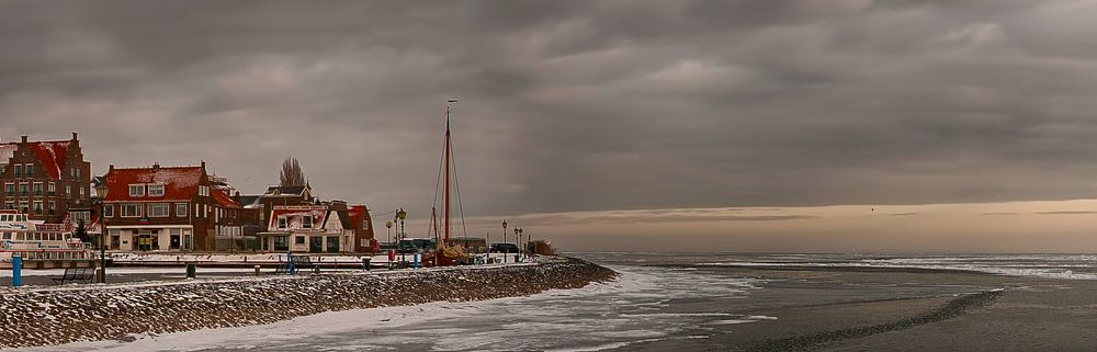 Vanaf het havenhuisje genomen panoramafoto die is opgebouwd uit meerdere foto's en die nog zicht geeft op een deel van de haven van Volendam
