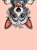 Digitaal kunstwerk van een vrolijk speels hondje die op haar hoofd hangt.