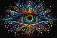 Deze muurschildering trekt op magische wijze de aandacht: Een surrealistisch ontworpen oog troont in het centrum van een universum van kleur, omringd door lichtgevende patronen, kosmische structuren en energetische vormen. De iris glinstert in een spectrum van groen, blauw, rood en geel - als een poort naar een andere dimensie. De donkere omgeving versterkt de helderheid en geeft het motief een mysterieuze diepte.