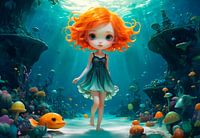 Het lieve kleine zeemeisje, zij leeft op de bodem van de zee, tussen het prachtige gekleurde koraal en de kleurige vissen. Zij leeft als een zeemeermin, de zeebodem is haar thuis. Haar fel oranje haren deinen mee met de golven. Het beeld is met behulp van ai gegenereerd.