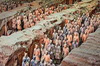 Close up van een aantal beelden in het beroemde Terracotta leger bij de stad Xi'An in China. Op de foto zijn verschillende rijen met soldaten te zien.