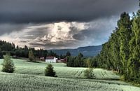 Noorwegen kent veel groen en ongerepte natuur. Zo ook hier met op de achtergrond een leuk wit huis.