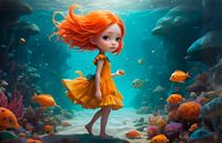 Het lieve kleine watermeisje, zij leeft op de bodem van de zee, tussen het prachtige kleurige koraal en de kleurige vissen. Zij leeft als een zeemeermin, de zeebodem is haar thuis. Haar fel oranje haren deinen mee met de golven, evenals haar oranje jurkje. Het beeld is met behulp van ai gegenereerd.