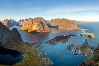 Het meest iconische locatie van de Lofoten, Noorwegen. Na een pittige klim de berg op om een fantastisch uitzicht te zien te krijgen boven het dorpje Reine.