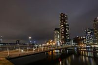 Zijaanzicht van de Rijnhaven-brug 's nachts met het Hotel van New York op de achtergrond, Rotterdam. Dit is een voetgangersbrug en het bevindt zich in Katendrecht. De lichten van de gebouwen maken mooie weerspiegelingen in het water.