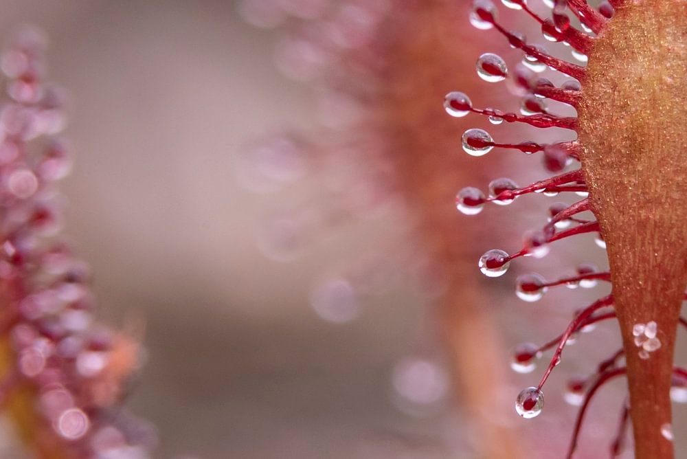 De prachtige blaadjes van de zonnedauw lijken net hoofdjes. Het is een vlees/insecten etend plantje van ongeveer 8 cm hoog.