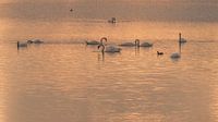 Zwanen aan het foerageren in het gouden uurtje tegen zonsondergang. Het water had een mooie kleur gekregen doordat de zon half achter de wolken verdween.