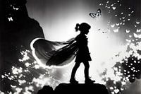 Het schilderij toont een scène met een zwart-wit meisje in de vorm van een silhouet met een gevleugelde cape. Het silhouet van het meisje is duidelijk zichtbaar, terwijl de gevleugelde cape achter haar naar beneden vloeit en sierlijk in de lucht zweeft. Het zwart-witte kleurenschema versterkt het contrasterende en esthetische aspect van de afbeelding. De combinatie van de meisjesfiguur, het silhouet en de gevleugelde cape creëert een sfeer van fantasie, lichtheid en elegantie. Het schilderij nodigt de kijker uit om in een wereld van dromen en verbeelding te duiken.