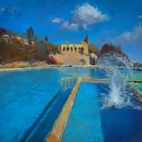 Zwembad op een hete dag in Zuid Frankrijk. Ik ben getuige van een wellicht verfrissende duik. In een "splash" (plons) moment is de actie voorbij. Een AI kunstwerk vertrokken vanuit een eigen schilderij. Snakken naar ontspanning.