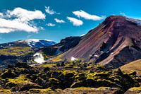 Toeristen wandelen door de hete bronnen en de sneeuw in de Landmannalaugar bergen in IJsland