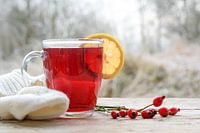 Hete rode rozenbottelthee met een schijfje citroen in een glazen mok op een rustieke houten tafel tegen een ijzig winterlandschap, kopieruimte, geselecteerde focus, kleine scherptediepte