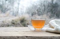 Hete thee op een rustieke houten tafel buiten op een koude winterochtend, geselecteerde nadruk, kleine scherptediepte