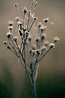 Close up van een wildgroeiende plant bij de uiterwaarden van de Nederrijn in Heteren, op de Betuwe in Gelderland. De plant is bedekt met een dun laagje rijp en de foto is bewerkt in natuurlijke aardetinten.