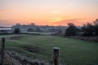 Landschap op de uiterwaarden van de Rijn in Heteren, op de Overbetuwe in Gelderland. Het is een koude winterochtend, en de zon komt bijna op.